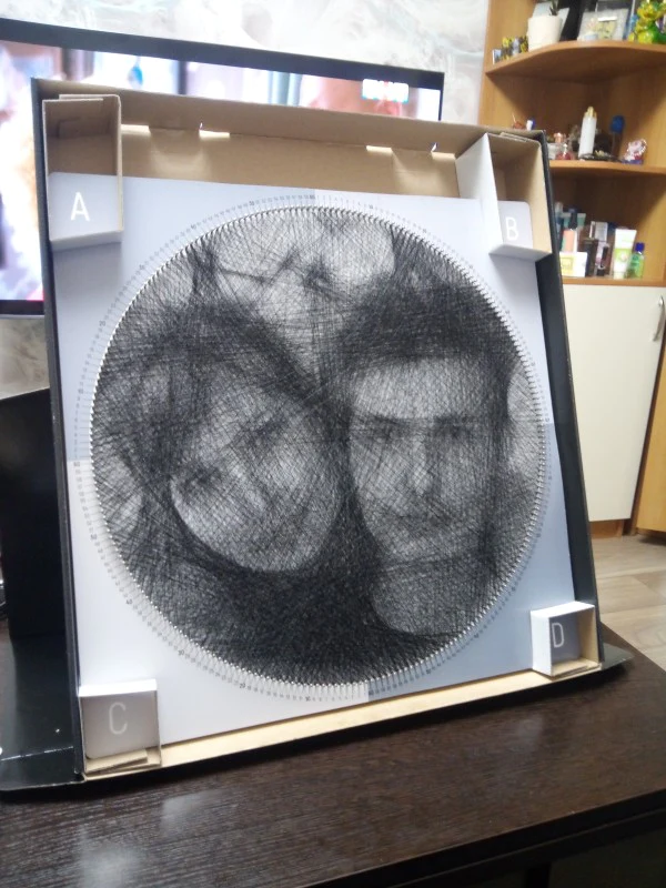 This face string art is a testament to the artist’s skillful craftsmanship and keen attention to detail. Each thread serves as a stroke of a brush, adding texture and nuance to the portrait, while also showcasing the artist’s ability to transform a simple medium into a striking visual representation.
